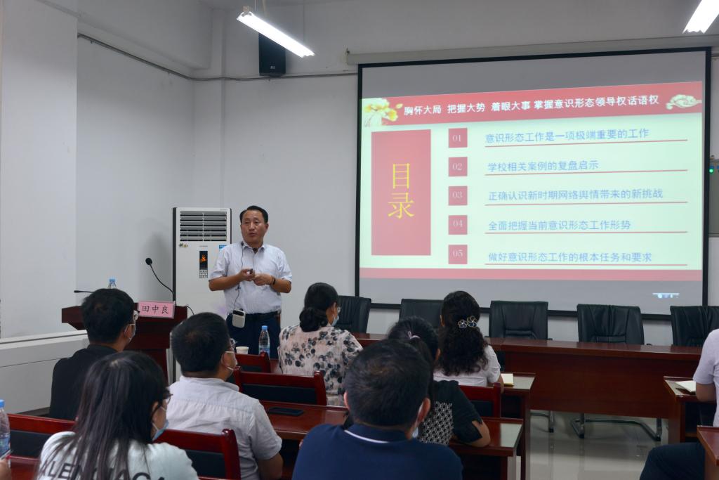田中良在报告中强调,守好意识形态主阵地是高校干部教师的共同责任。要不断强化党管宣传、党管意识形态,牢牢掌握意识形态工作的领导权、主动权。要高度重视网络安全,进一步提升网络舆论引导水平,严密防范网上意识形态渗透,牢牢把握网络意识形态主导权。各位老师在授课过程中要把知识传授与课程思政整合好、实践好,在专业传授中融入家国情怀、成人成才、就业考研、三观引领等内容,提升育人温度,加强指导力度。