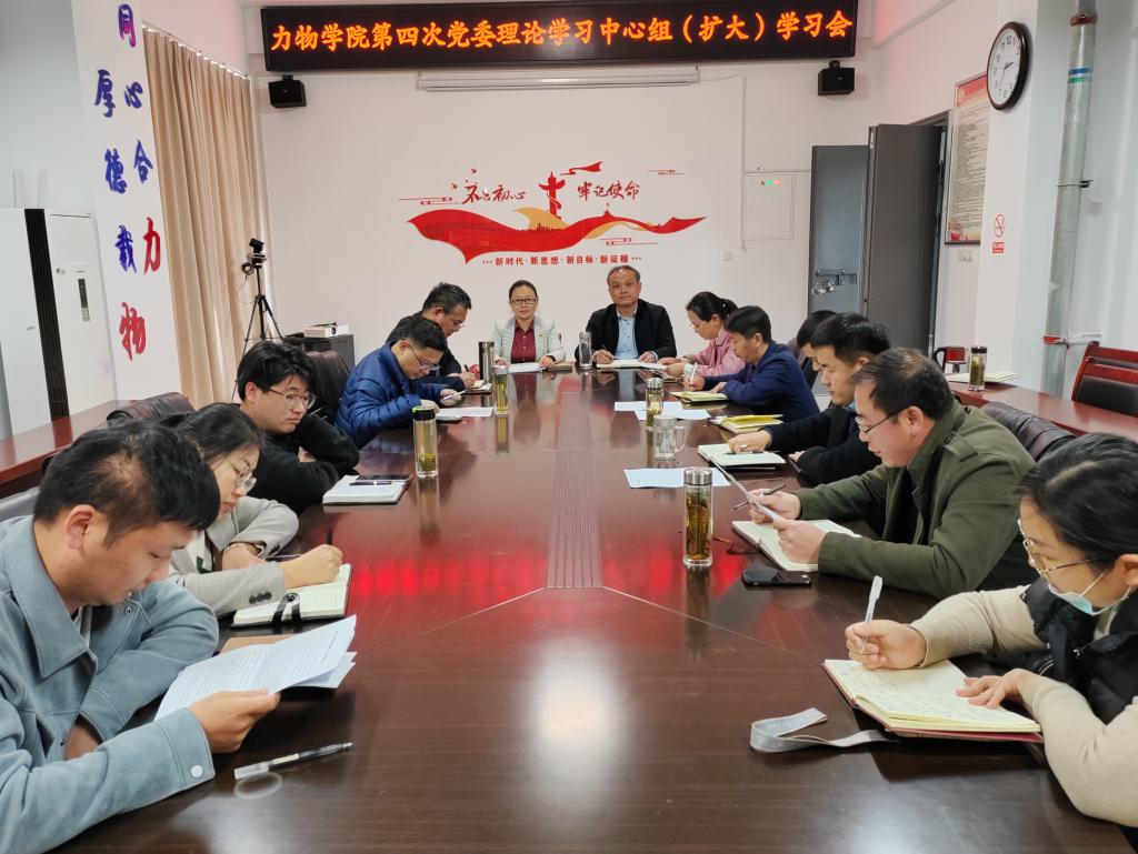 3月30日下午,力物学院在明道楼A320会议室召开党委理论学习中心组(扩大)学习会,集中学习习近平总书记为《复兴文库》所作序言和中共中央办公厅印发的《关于在全党大兴调查研究的工作方案》。学院领导、党委委员、辅导员、党支部书记、系主任、院办人员等参加学习。学习会由学院党委书记刘艳主持。