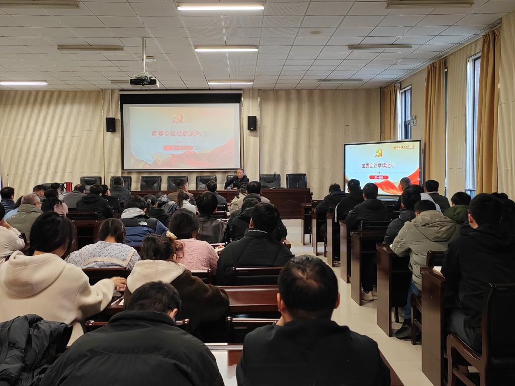 12月13日下午,awc777万象城娱乐官网党委在明道楼一楼报告厅开展党史学习教育专题培训暨党委理论学习中心组(扩大)学习会。学院全体师生党员参加学习会议。会议由学院党委书记孙东升主持。